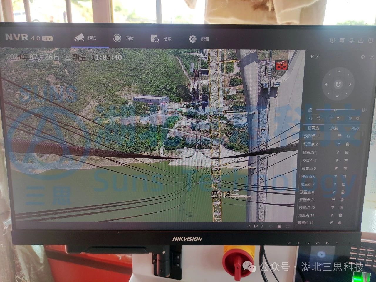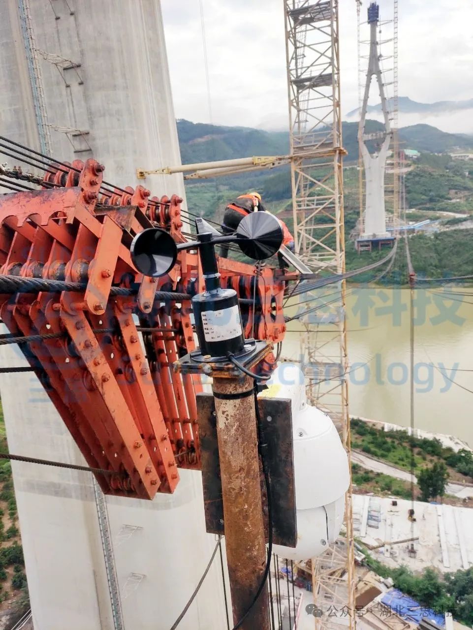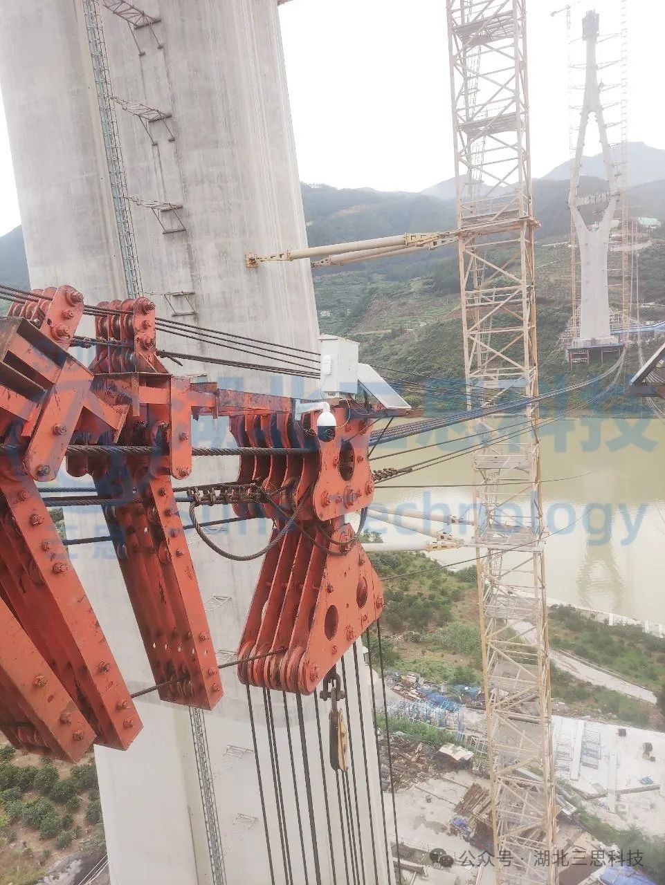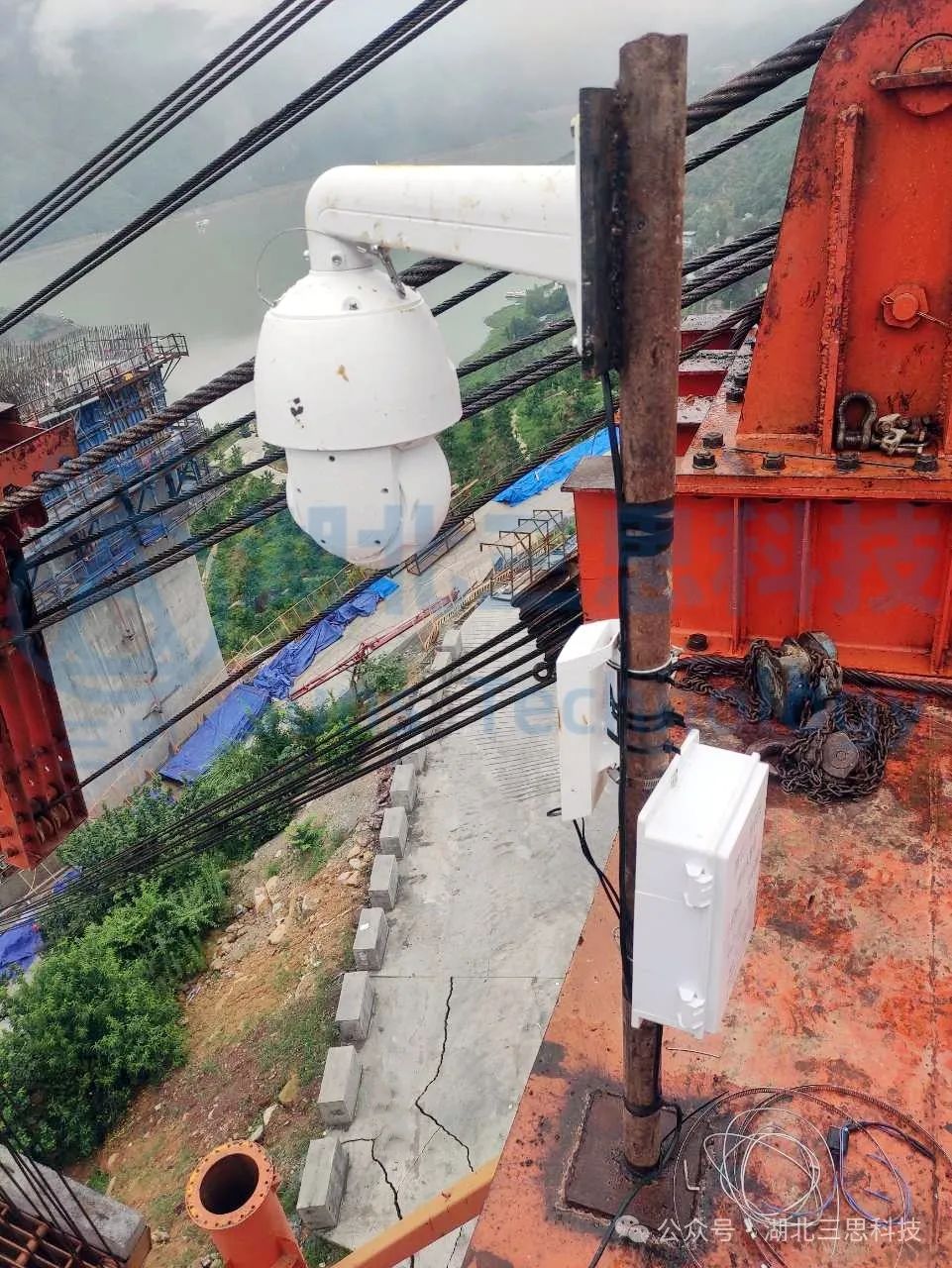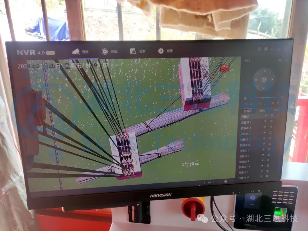 現(xiàn)場多臺槍機分別安裝在卷揚平臺附近,監(jiān)視卷揚的工作情況;兩個塔頂 各安裝多個球形攝像機用于鳥瞰纜索吊區(qū)域施工情況。