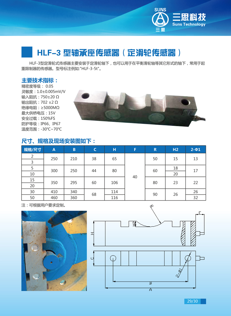 HLF-3型定滑輪式傳感器主要安裝于定滑輪軸下,也可以用于在平衡滑輪軸等其他形式的軸下,常用于起重限制器的傳感器。