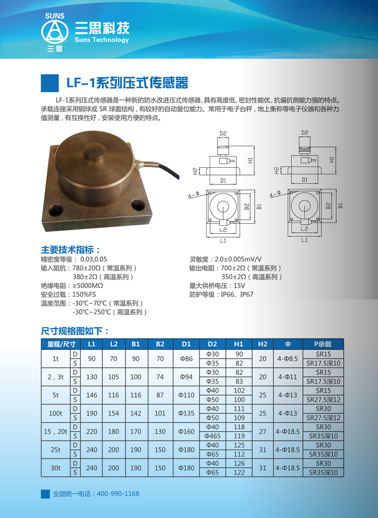 LF-1系列壓式傳感器是一種新的防水改進壓式傳感器,具有高度低、密封性能優(yōu)、抗偏抗側(cè)能力強的特點。承載連接采用銅球或SR球面結(jié)構(gòu),有較好的自動復(fù)位能力。常用于電子臺秤、地上衡稱等電子儀器和各種力值測量,有互換性好、安裝使用方便的特點。