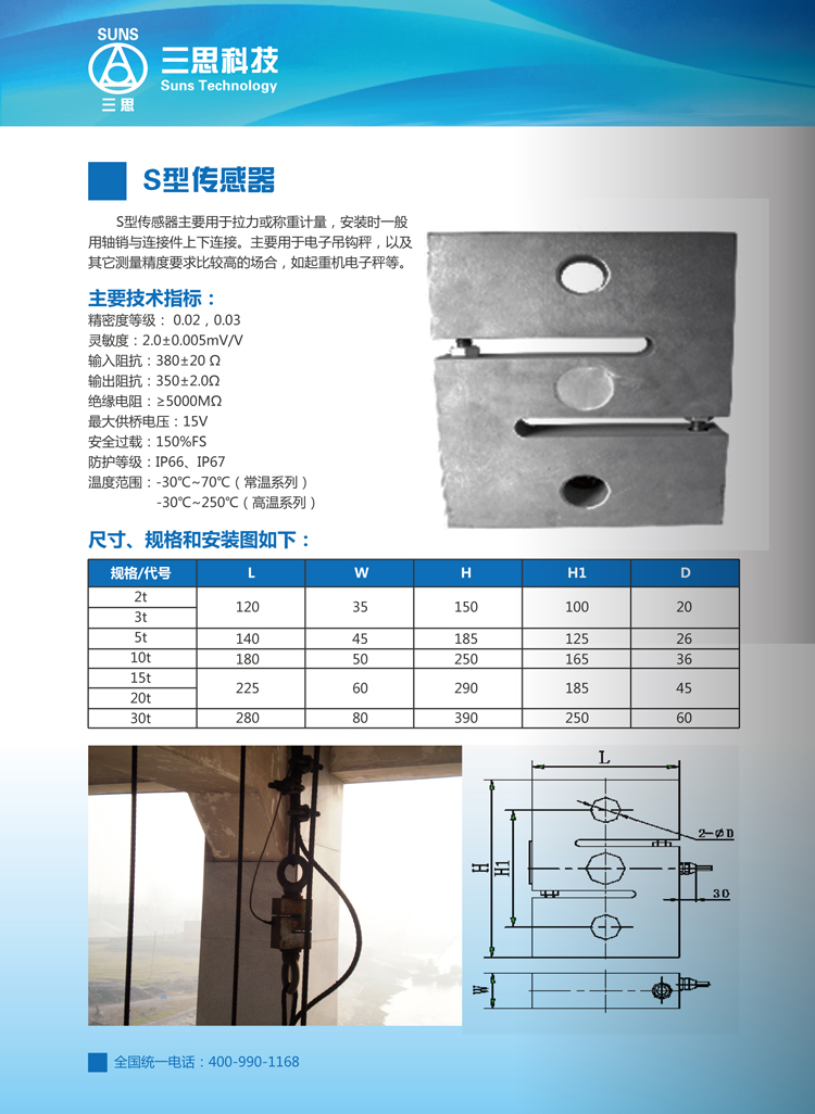 S型傳感器主要用于拉力或稱(chēng)重計(jì)量,安裝時(shí)一般用軸銷(xiāo)與連接件上下連接。主要用于電子吊鉤秤,以及其它測(cè)量精度要求比較高的場(chǎng)合,如起重機(jī)電子秤等。