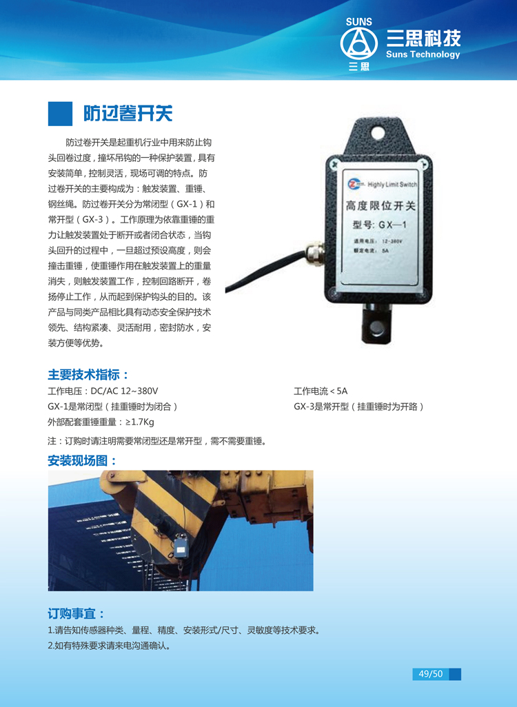 防過(guò)卷開關(guān)是起重機(jī)行業(yè)中用來(lái)防止鉤頭回卷過(guò)度,撞壞吊鉤的一種保護(hù)裝置,具有安裝簡(jiǎn)單、控制靈活、現(xiàn)場(chǎng)可調(diào)的特點(diǎn)。防過(guò)卷開關(guān)的主要構(gòu)成為:觸發(fā)裝置、重錘、鋼絲繩。防過(guò)卷開關(guān)分為常閉型 (GX-1)和常開型(GX-3)。工作原理為依靠重錘的重力讓觸發(fā)裝置處于斷開或者閉合狀態(tài) ,當(dāng)鉤頭回升的過(guò)程中,一旦超過(guò)預(yù)設(shè)高度,則會(huì)撞擊重錘,使重錘作用在觸發(fā)裝置上的重量消失,則觸發(fā)裝置工作,控制回路斷開,卷?yè)P(yáng)停止工作,從而起到保護(hù)鉤頭的目的。該產(chǎn)品與同類產(chǎn)品相比具有動(dòng)態(tài)安全保護(hù)技術(shù)領(lǐng)先、結(jié)構(gòu)緊湊、靈活耐用、密封防水,安裝方便等優(yōu)勢(shì)。