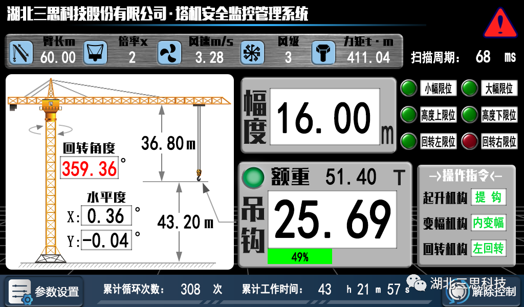 起重機(jī)安全監(jiān)控系統(tǒng)可以實(shí)時(shí)監(jiān)測設(shè)備運(yùn)行過程中的高度、角度、起重量、角度、力矩、風(fēng)速等參數(shù),具有完整的應(yīng)用功能。