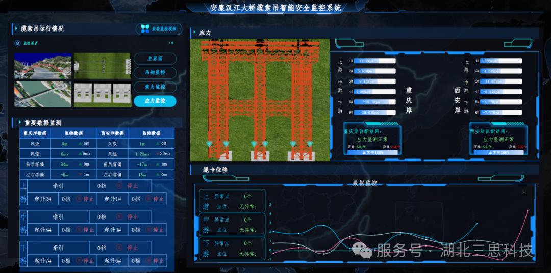 由湖北三思科技自主研發(fā)的纜索吊集中智能控制系統(tǒng)正式亮相本次載荷試驗(yàn)。本系統(tǒng)對主承重索、牽引索、纜風(fēng)索、扣索、背索等索力及起重拉力、塔偏、錨碇與錨梁位移、卷揚(yáng)機(jī)溫度等進(jìn)行實(shí)時監(jiān)測,將視頻與數(shù)據(jù)平臺結(jié)合,直面施工現(xiàn)場卷揚(yáng)機(jī)工作情況,真實(shí)反映吊裝過程中受力情況及塔偏,有異常情況系統(tǒng)會自動報警,保證纜索吊系統(tǒng)的安全穩(wěn)定性,為整個吊裝過程提供安全強(qiáng)有力保證。