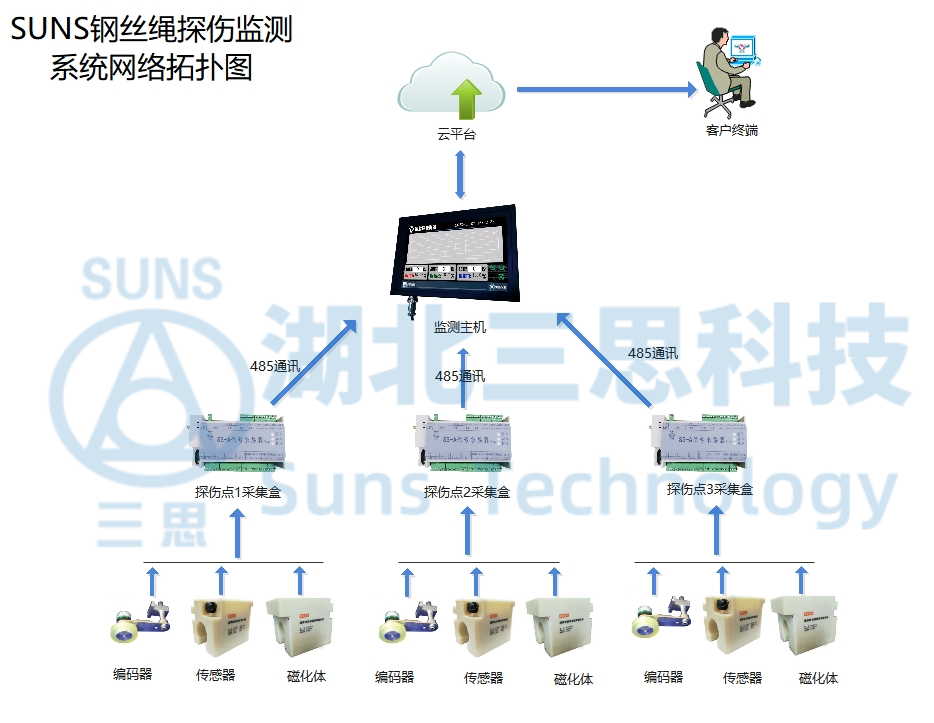 SUNS鋼絲繩探傷監(jiān)測系統(tǒng)由多部分(可選配)軟硬件組成,分別為鋼絲繩探傷傳感器與磁化體、行程編碼器、數(shù)據(jù)監(jiān)測主機、物聯(lián)云平臺。